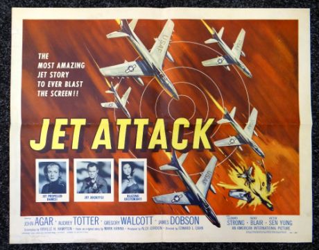 COLLECTION OF SIX CINEMA POSTERS WITH AVIATION IMAGES mainly US one-sheets, comprising the following (1) Emergency Landing, William Beaudine, 1941, 104 x 69cms, (2) Destination 60,000, George Waggner, 1957, 104 x 68cms, (3) Jet Over the Atlantic, 103 x 68cms, (4) Mosquito Squadron, Boris Sagal, 1969, 104 x 68cms, (5) The Night My Number Came Up, Leslie Norman, 1955, 76 x 34cms, (6) Jet Attack, Edward L Cahn, 1958, 55 x 72cms