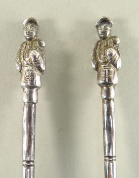 SET OF TWELVE CHINESE SILVER COFFEE SPOONS, Wang Hing marked WH90, with finials as Mandarins in robes, bamboo style stems and gilt bowls, 3.9 t.oz.(12)