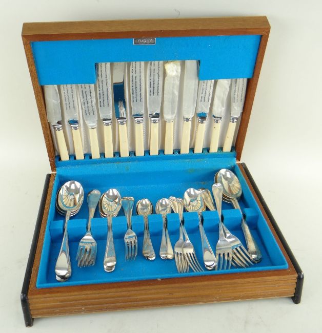 MIXED SILVER CANTEEN OF STEEL CUTLERY & SILVER FLATWARE including six tablespoons, six dessert spoons, six dessert forks, seven teaspoons and six table forks, six table knives and six dessert knives with simulated bone ivory handles, overall total weighable silver 52 t.oz