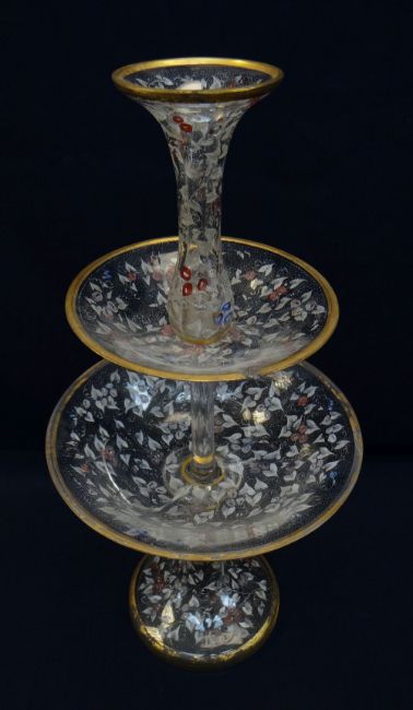 ENAMELLED GLASS TIERED COMPORT, probably for the Turkish market, decorated with red and blue flowering morning glory (convululus) vines on a seeded ground, gilt rims, polished pontil mark, 56cm high