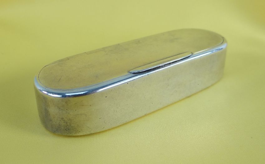 BELIEVED 19TH CENTURY SILVER SNUFF BOX of plain oblong form with hinged lid, rubbed hallmarks, 82.5gms