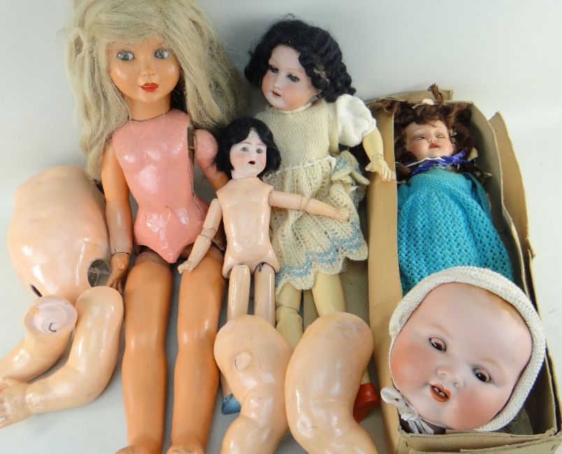 Condition Report: Italian doll damaged body, other composition bodies repainted, chipped, damages.