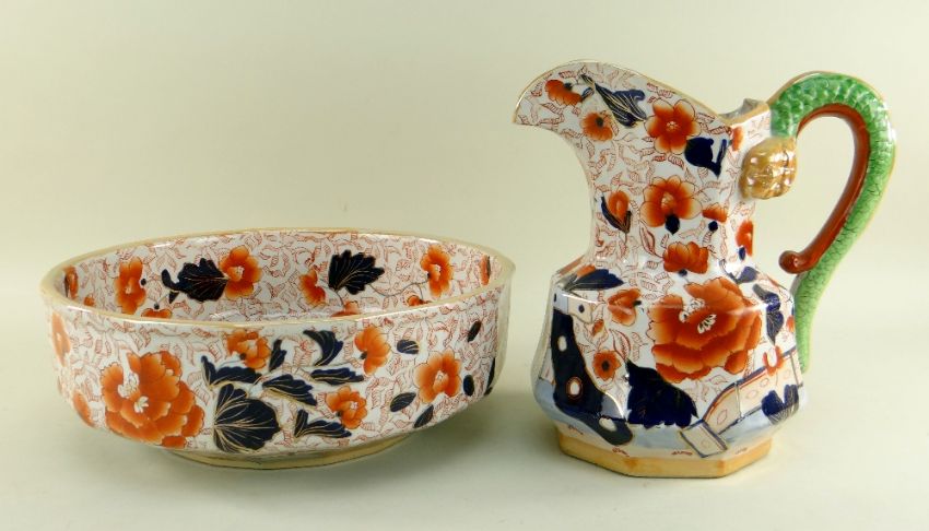 REPRODUCTION 'MASONS IRONSTONE' STYLE PORCELAIN WATER JUG & BASIN, the octagonal jug with typical hydra handle, both decorated in the Imari palette with flowers
