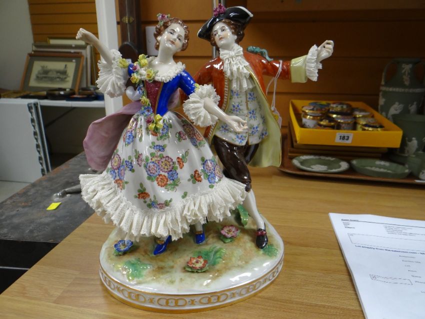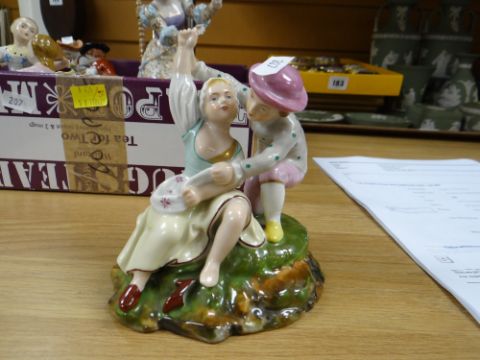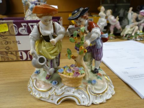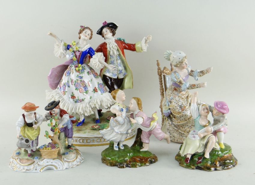 ASSORTED GERMAN PORCELAIN FIGURINES including pair of Hoscht figures of dancing children, large Meissen-style group of dancing couple and two others (5)