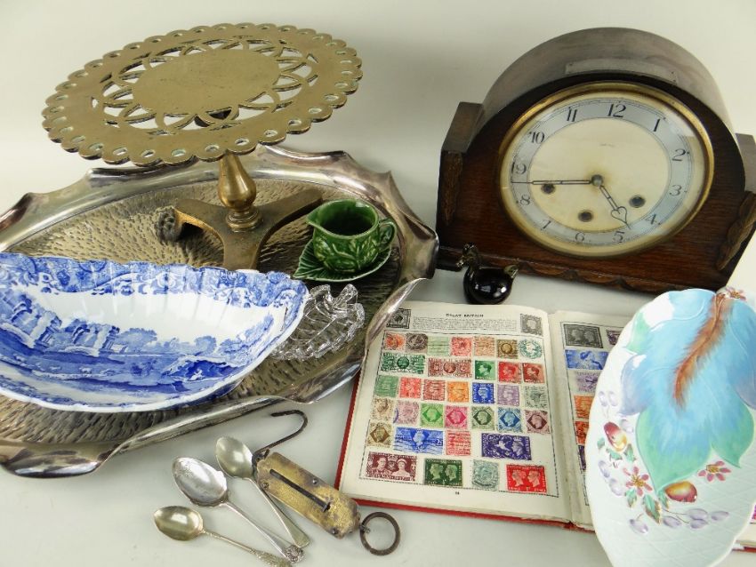 ASSORTED VINTAGE COLLECTABLES including Smith's oak cased mantel clock with engraved presentation inscription dated 1952, pierced brass tripod trivet, Hughes balance scale, plated tea tray, Victory stamp album and sundry china ornaments
