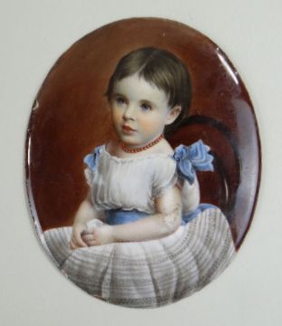 PAIR LATE 19TH CENTURY PORTRAIT MINIATURES, enamel on copper, depicting a young girl in white dress with blue sash and ribbons, and a young woman with lace cuffs and blue bow, both inscribed verso, 'Lee & Co. Patent, Cardiff', 7.1 x 5.8cms and 6.9 x 5.5cms (2)
