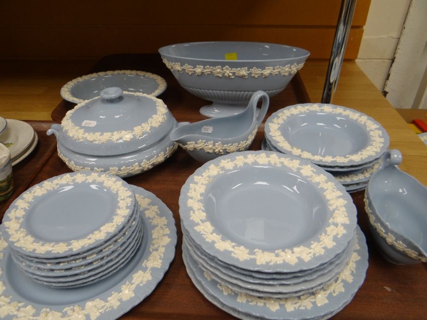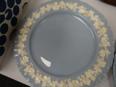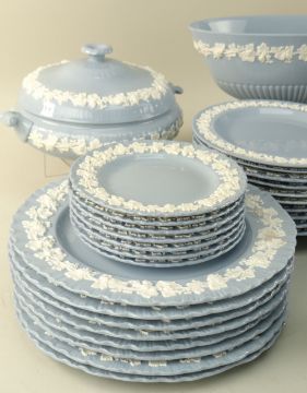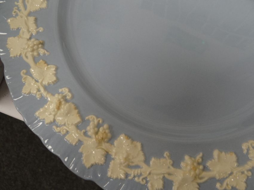 WEDGWOOD EMBOSSED QUEENS WARE POTTERY PART DINNER SERVICE, comprising tureen, oval comport, 2 sauce boats, oval vegetable dish, 2 meat platters, 34 various plates/bowls (41)Yes looking at the dinner service, it looks like nearly half is starting to brown on the decoration.In total two large plates, two platers, five medium plates and one bowl are browning. Also, one of the large platters has paint on the boarder?The rest including the tureen, the two gravy boats, the centre piece, the rest of the bowls and plates are good.