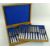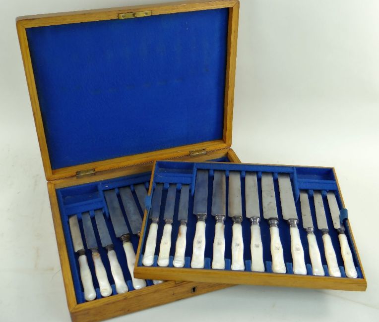 BOXED CANTEEN OF EDWARDIAN MOTHER-OF-PEARL HANDLED TABLE KNIVES & DESSERT KNIVES, steel blades, handles engraved with monogram AW, early 19th Century