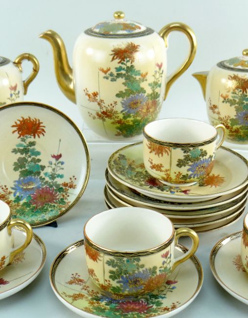 JAPANESE SATSUMA EARTHENWARE TEA SET, for six, decorated with sprays of kiku (21)
