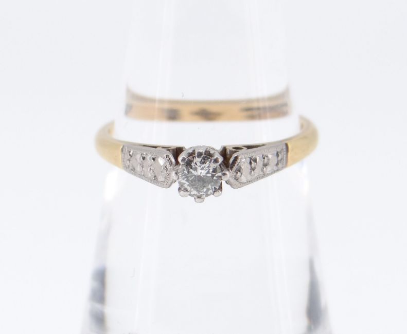 18CT GOLD & PLATINUM DIAMOND RING, the claw set single stone 0.1cts approx., ring size M / N, 2.7gms, in black square ring box