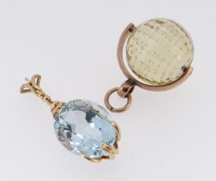 9CT GOLD REVOLVING FOB pale yellow gem possibly a citrine together with yellow metal set pendant drop believed blue topaz, 29gms overall approx. (2)