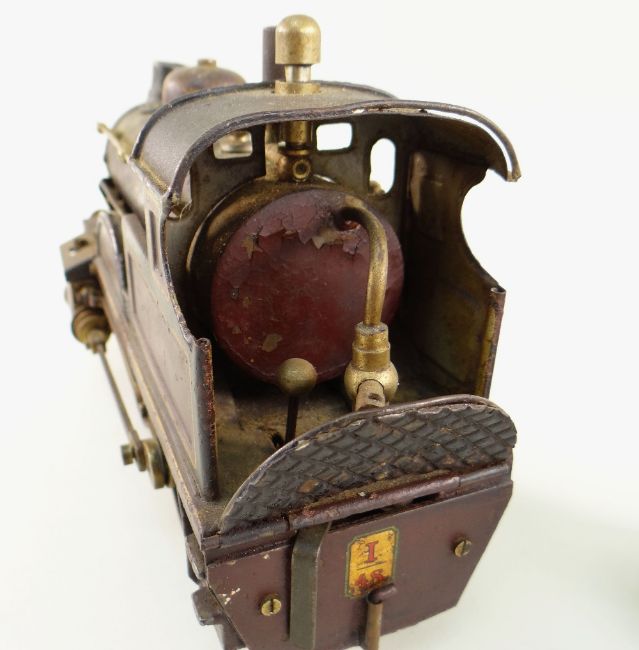 Condition: loco - chimney loose (formerly solder repair), foot plate bent, smoke box paint losses, roof dented and wire lifting, surface dirt. Tender - front coupling broken, rust spots, dints, lacks 3 hub caps, surface dirt.