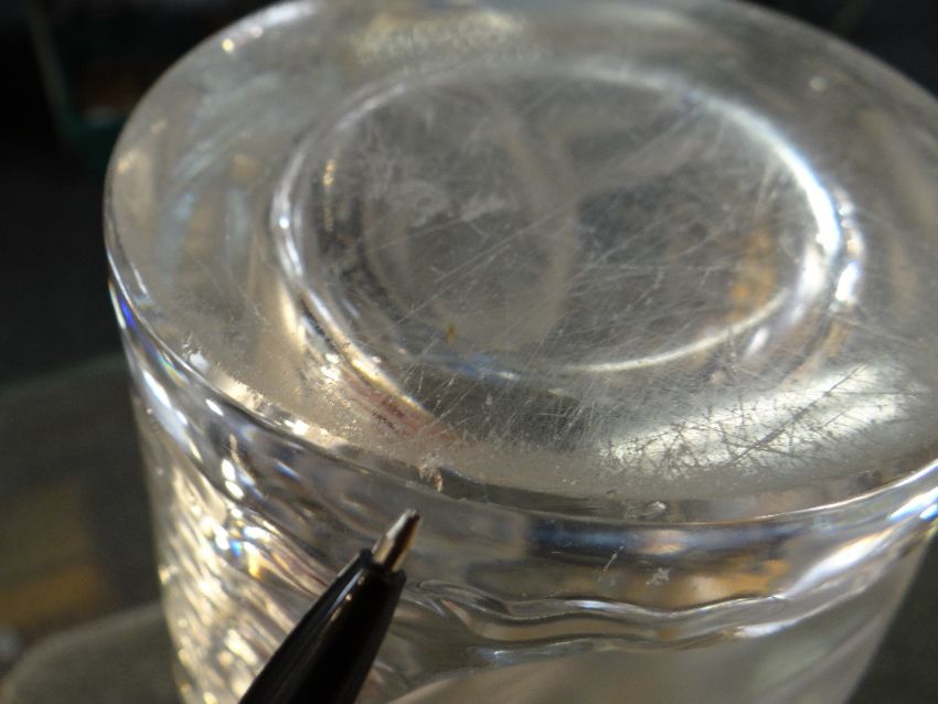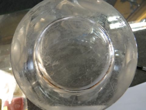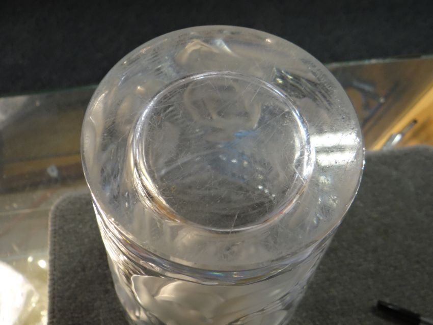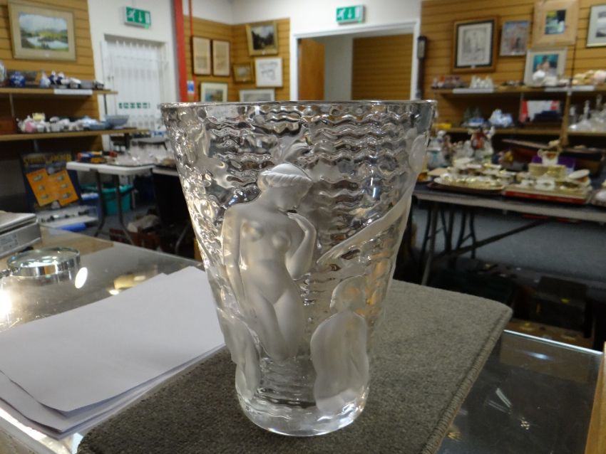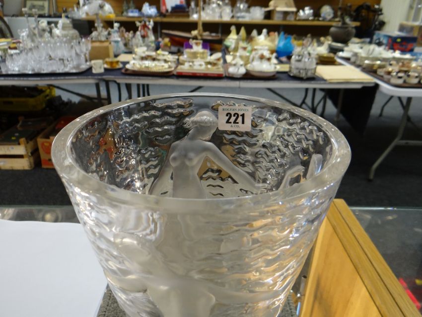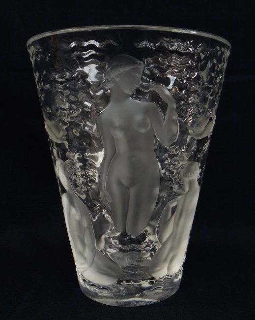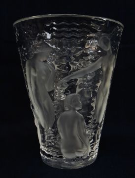 'ONDINES': A CRYSTAL LALIQUE GLASS VASE, designed in 1952, clear and frosted glass, decorated with a nudes in water, etched mark, 23.6cm highThere are a few chips to the base and lots of scratches to the underside.