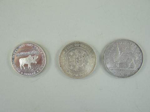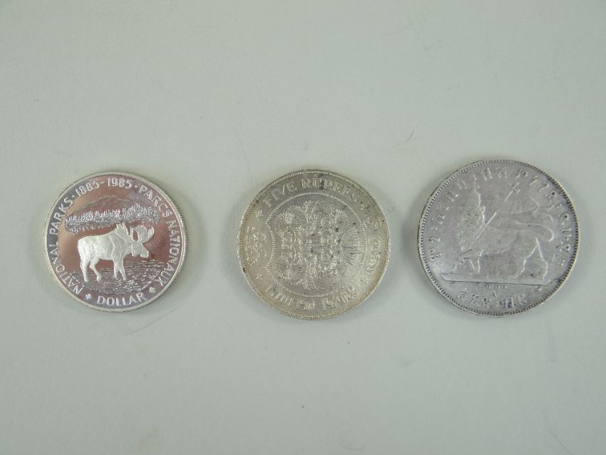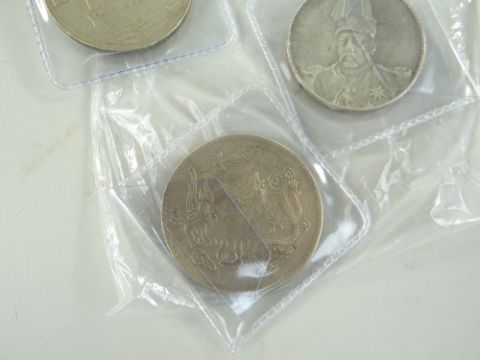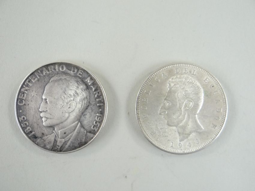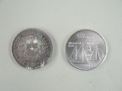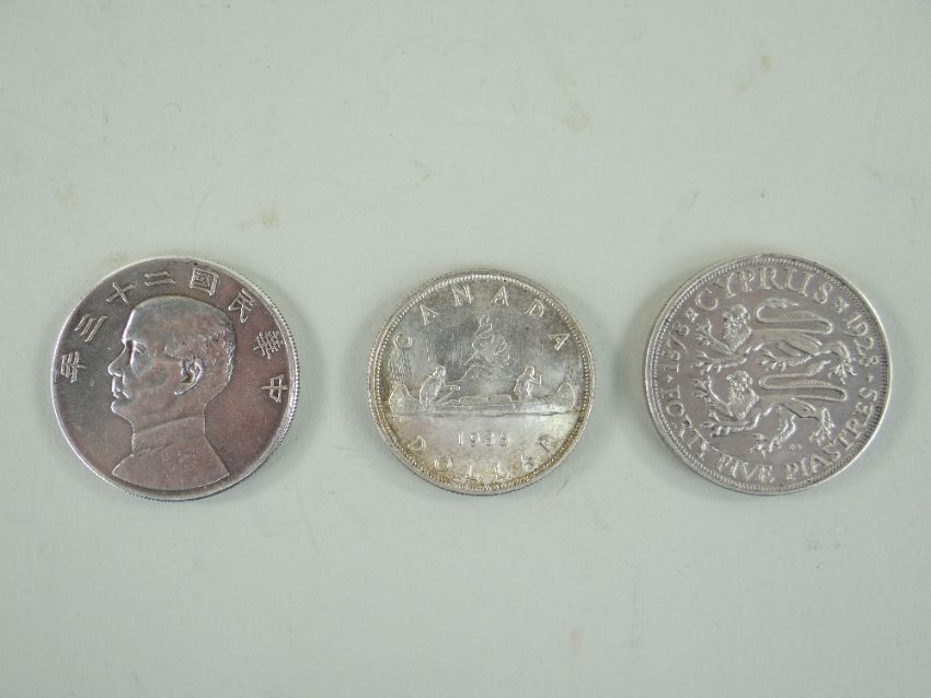 ASSORTED COLLECTABLE WORLD COINS comprising 1933 Republic of Cuba 1 peso, 1853-1953 Republic of Cuba 1 peso, 1878-1928 Cyprus 45 piastres, 1943 Mexico 5 sucres, two silver Chinese commemorative 1 dollars (Guangxu 34th year pei yang dragon & Sun Yat-sen an 23), Canada Montreal Olympic 5 dollar coin, 1957 5 rupees coin, 1870 & 1895 Chile 1 peso coins, 1963 Canada dollar, 1867-1967 Canada dollar, 1873-1973 Canada dollar, 1983 Edmonton Canada dollar, 1885-1985 National Parks Canada dollar, 1935 Canada dollar, 1939 Canada dollar, 1949 Canada dollar, 1950 Canada dollar, 1858-1958 British Columbia Canada dollar, and four Chinese metal alloy reproductions, (25 coins / tray not included)