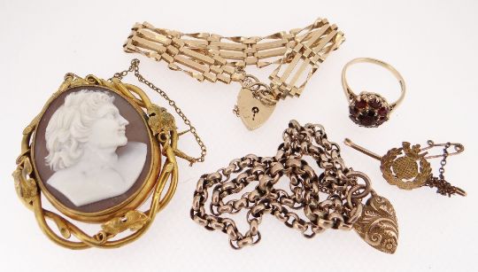 GROUP OF JEWELLERY, including 9ct gold and garnet cluster dress riing, gross wt. 3.8g, 9ct gold gatelink bracelet, 9.7g, unmarked yellow metal belcher chain converted to a bracelet with engraved heart clasp, 17.8g, engraved cameo shell locket in gold plated twisted vine frame (vine leaves damaged), 6cm high, and unmarked yellow metal Royal Marines emblem bar brooch (5)