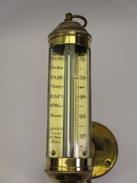 REPRODUCTION BRASS SHIP'S TYPE STICK BAROMETER on a gimbal mount wall bracket, 93cms L