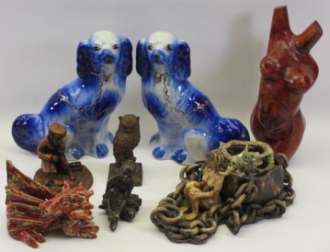 MIXED COMPOSITION ANIMALS & FIGURINES to include a pair of pottery Staffordshire type dogs in blue and white, Studio Pottery dragons, bronze effect ballerina girl ETC