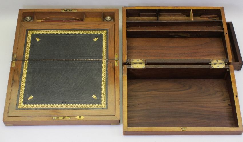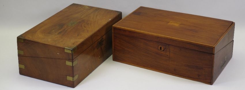 VICTORIAN WRITING SLOPES (2) including a walnut example with brass mounted corners, 15.5cms H, 40.5cms W, 23.5cms D, the other mahogany with boxwood edging, incomplete and requiring restoration, 15.25cms H, 41cms W, 25cms D