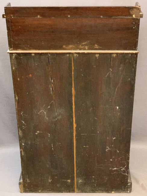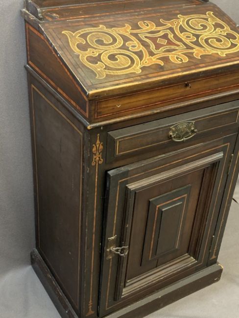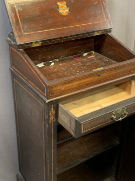 EARLY 20TH CENTURY CLERKS TYPE DESK with painted detail having a galleried top and sloped fall with simulated inlay, the interior with crest type shield marked 'J Martin 1902', over a single drawer, single door base section having further simulated inlay painted detail on a plinth base, 104.5cms overall H, 60cms W, 42cms D
