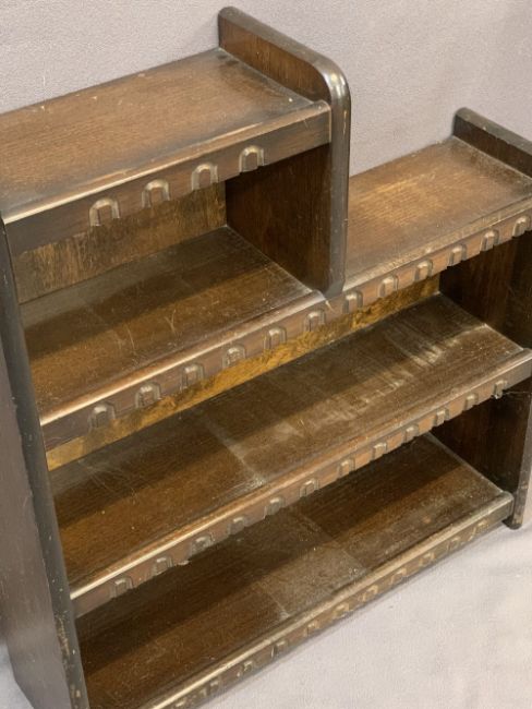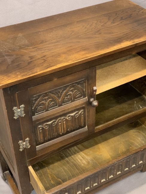 VINTAGE & REPRODUCTION OAK FURNITURE, FOUR PIECES to include a hutch cupboard with twin opening doors and lower single drawer on turned supports, 85cms H, 76cms W, 38cms D, Priory style open bookcase, 81cms H, 73cms W, 20cms D, similarly styled twin-flap tea trolley with single end drawer and under-tier shelf, 75cms H, 68cms L, 43.5cms W flaps down and a lidded blanket chest with carved top panel details, 53.5cms H, 105.5cms W, 46cms D