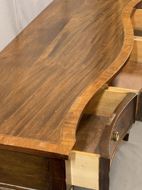 REPRODUCTION CROSSBANDED MAHOGANY SERPENTINE FRONT HALL SIDEBOARD having three frieze drawers with ring pull handles on tapering supports with spade feet, 83.5cms H, 122cms W, 45.5cms D