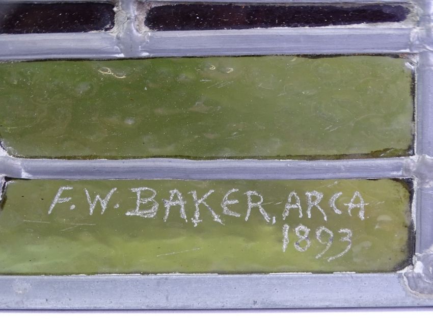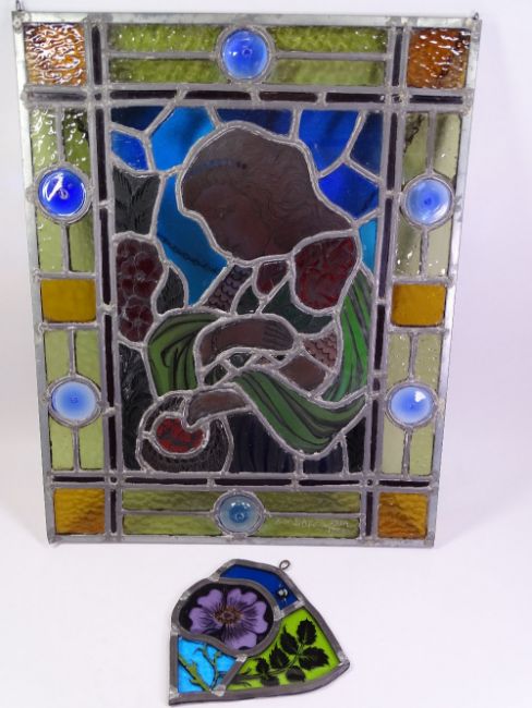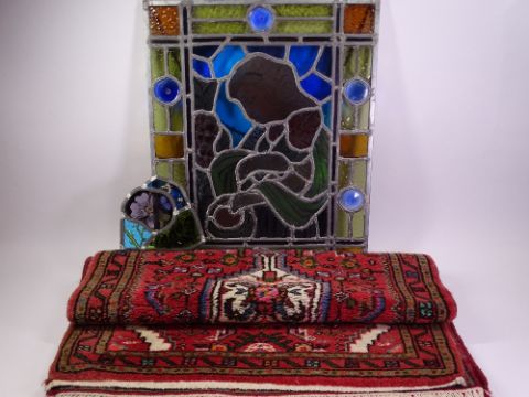 STAINED LEADED GLASS PANEL inscribed F W Baker ARCA 1893, 56 x 45cms and a red ground tassel end woollen rug, 110 x 70cms ETC