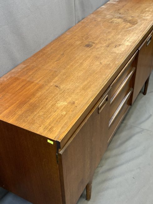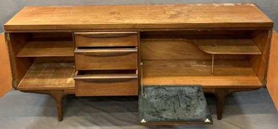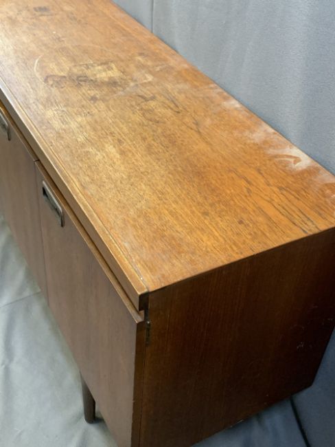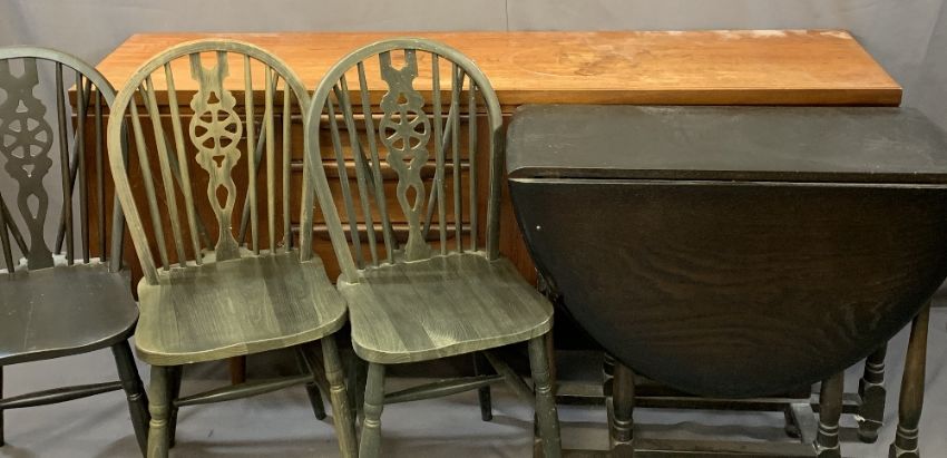 GREAVES & THOMAS MID-CENTURY LONG TEAK SIDEBOARD, dark oak Priory style gate leg table and three wheelback dining chairs, 77.5cms H, 176cms L, 45cms D the sideboard, 74.5cms H, 84.5cms L, 39.5cms W the table closed (repolishing required to the sideboard)