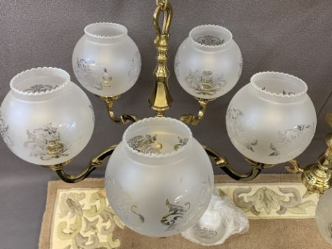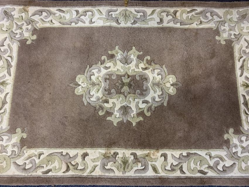 HANDMADE INDIAN TUFTED RUG, brass effect ceiling chandeliers and an oak framed woolwork tapestry firescreen, 168 x 109cms the rug