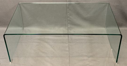 ULTRA MODERN HEAVY GLASS SET OF THREE TABLES, 40cms H, 108.5cms W, 60cms D the largest