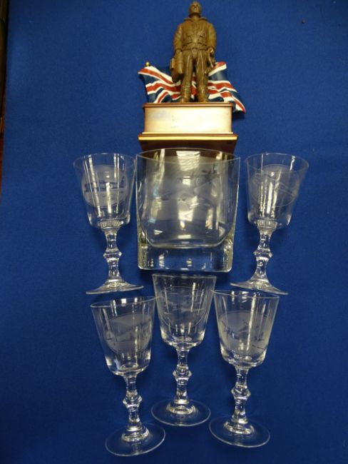 AVIATION - ETCHED GLASSWARE depicting Battle of Britain scenes and Bradford Exchange Limited Edition figure Battle of Britain The Few, Bronzed Airman Sculpture
