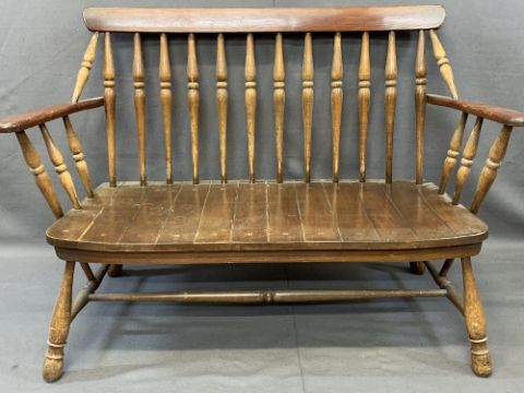 ERCOL STICK BACK ARMCHAIR and a spindle back wood seated couch, unbranded, 103cms H, 76cms W, 48.5cms D and 121cms W, 48cms seat depth measurements respectively (cushions available for the chair as a gift from the vendor)