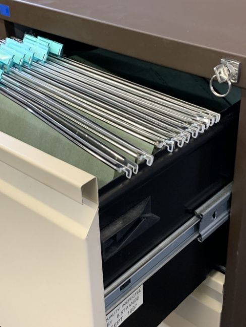 MODERN FOUR DRAWER METAL FILING CABINET WITH KEY, cream and brown, 132cms H, 46cms W, 62cms D