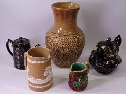 MINTON MAJOLICA JUG, Stamped '30 553' with snail handle, 12cms H, Copeland stoneware jug, Jackfield tea and coffee pots and a Denby stoneware vase, 33cms tall