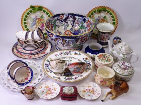 STAFFORDSHIRE TEAWARE, MASONS IRONSTONE PEDESTAL BOWL, 28cms diameter and a quantity of other china items