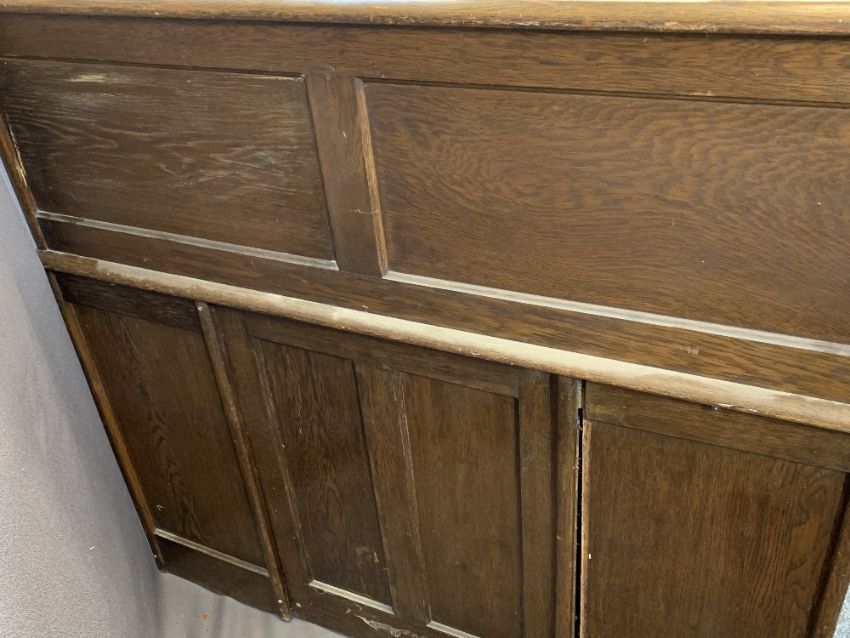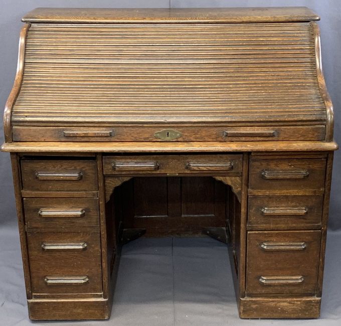 VINTAGE OAK ROLLTOP DESK, the tambour front opening to reveal a fitted interior of pigeonholes and drawers over a central frieze drawer, panelled back and pedestals of top slides over two small and single deep drawer, locking key present, 115.5cms H, 120cms W, 76cms D