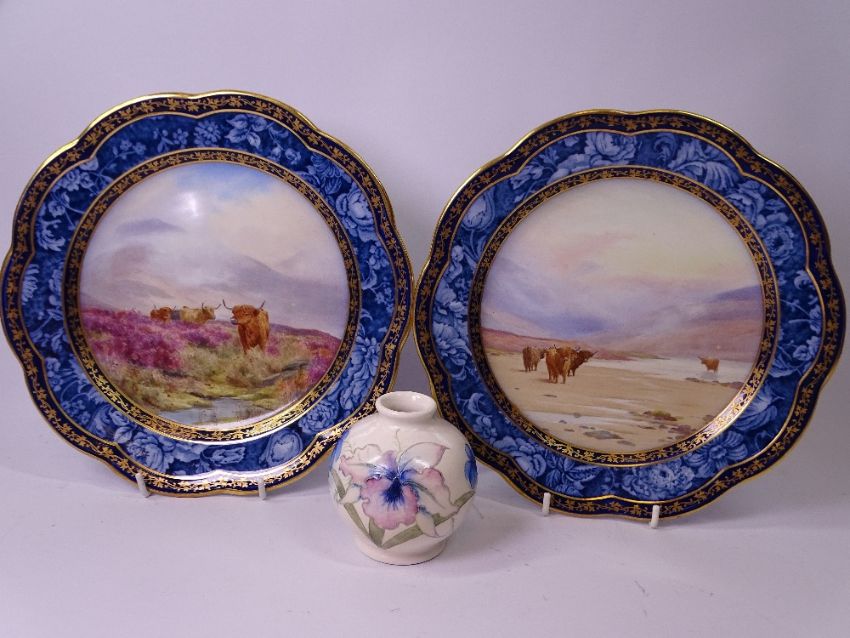 MOORCRFOT SHORT BULBOUS VASE - Hibiscus predominantly blue on white, 9cms tall and a pair of Highland Cattle decorated lossolware plates, signed C B Wood