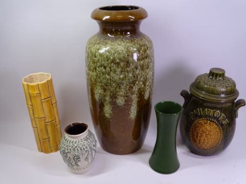 WEST GERMAN RUMTOPF LIDDED PUNCH JAR, 29cms H, West German Scheurich' Kermin Studio Pottery vase, 46cms H, Bourne Denby vase, 20cms H, Sylvac bamboo effect vase, 26cms H and another small bulbous West German vase