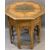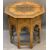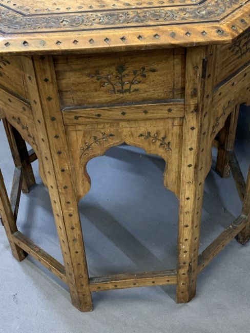 PERSIAN STYLE BRASS INLAID FOLDING TABLE, the octagonal top with central flower detail and multi-bordered edge on an inlaid folding base having shaped detail to the individual panels, 61cms H, 60.5 x 60.5cms top, lots of the tiny brass inlays absent