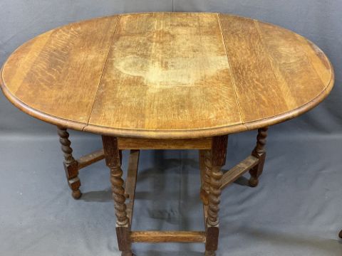 OAK BARLEY TWIST GATELEG DINING TABLE & ONE OTHER with two Edwardian cane seated side chairs, 74cms H, 91cms L, 49cms W and 73.5cms H, 85cms L, 33cms W the two tables closed