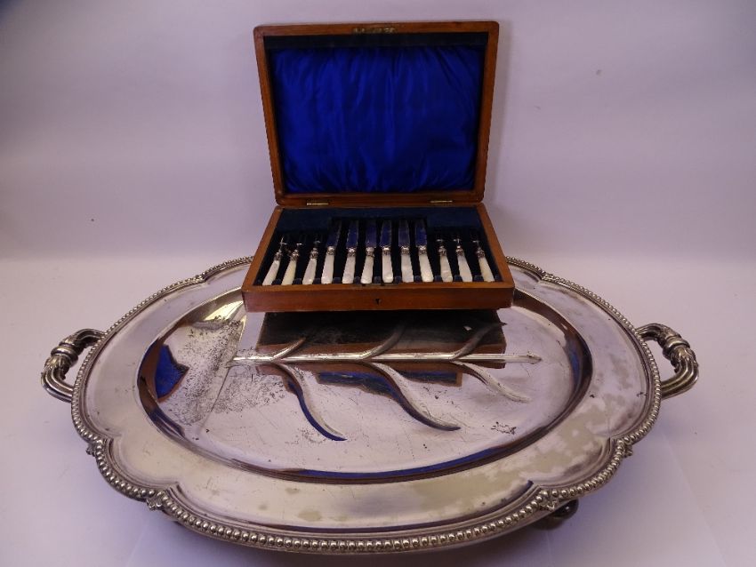 GOOD EPNS TWIN-HANDLED MEAT SERVER WITH DRAINER and hot water cap with a set of six mother of pearl handled pastry knives and forks, oak cased, 68cms L the server
