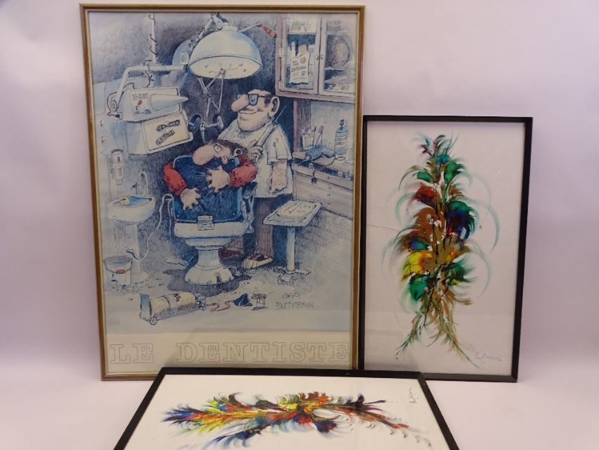 PAUL MANN prints, a pair of mid-century style abstract works, 50 x 30cms and GARY PATTERSON framed comical poster entitled 'Le Dentiste'
