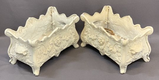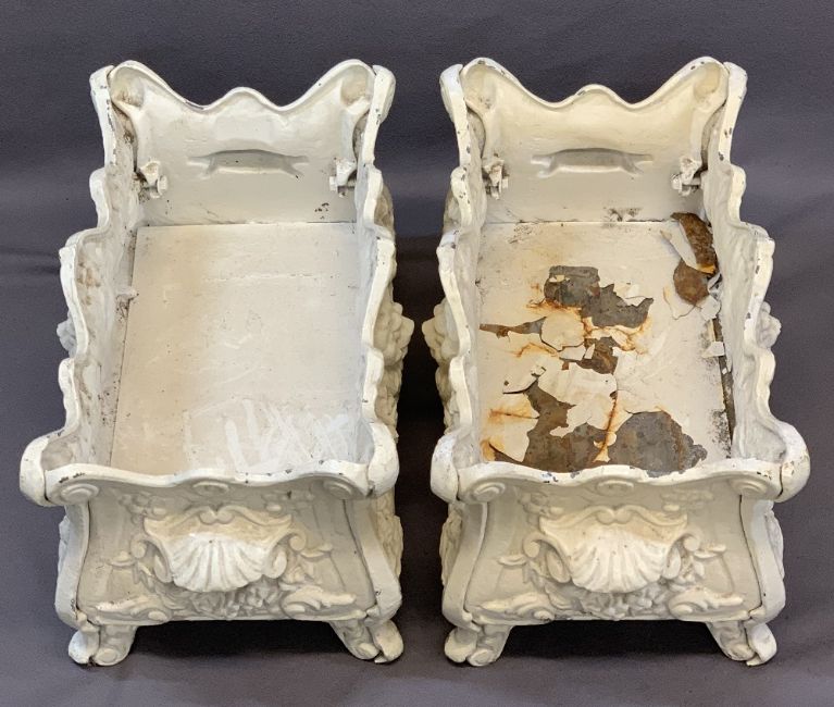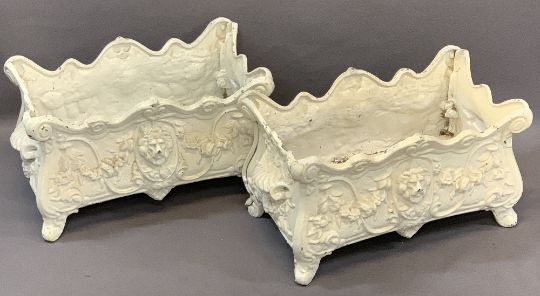 LION MASK & SWAG DECORATED CAST IRON PLANTERS, A PAIR, Rococo style with side carry handles, both painted, 27cms H, 48cms W, 28cms D