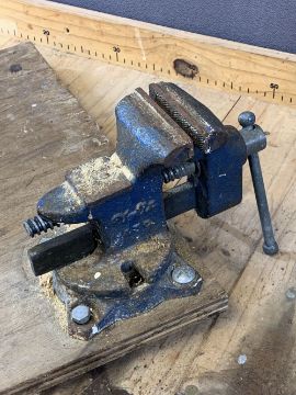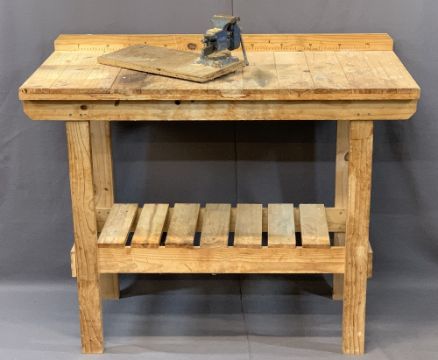 MODERN PINE WORKBENCH with small metal vice, 97cms overall H, 116.5cms W, 54cms D