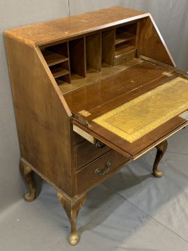 VINTAGE BURR WALNUT FALL-FRONT BUREAU with interior drawers and pigeonholes over three drawers on cabriole supports, 101.5cms H, 79cms max W, 45.5cms max D
