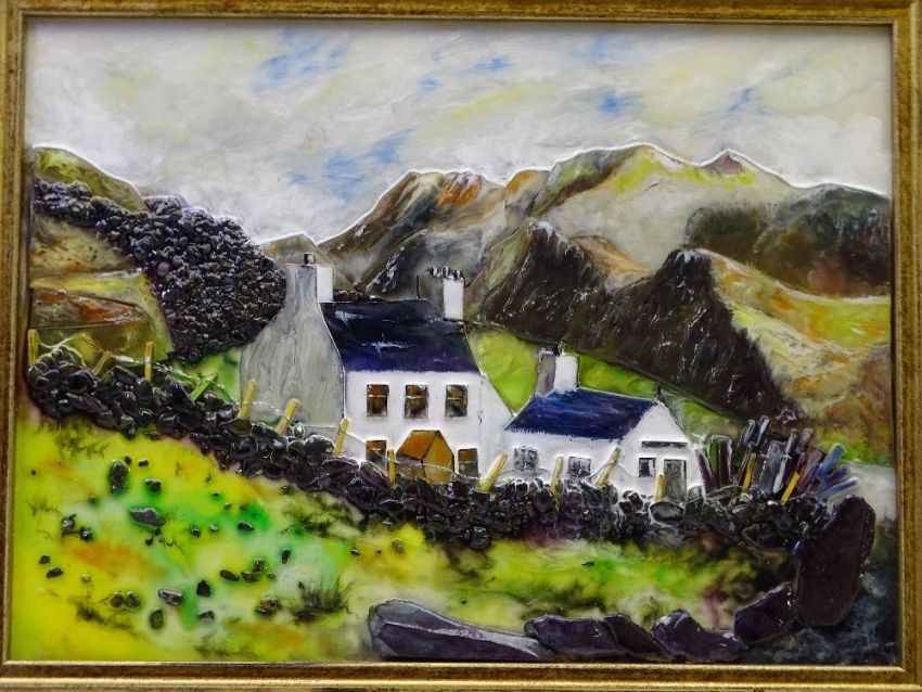 KAREN JONES glass collage within a frame, entitled - 'Fron Heulog, Dinorwig', signed, 42 x 53cms overall, ALLAN INGHAM limited edition print 316/600 - 'Shepherd's Delight', with certificate verso and a framed mirror