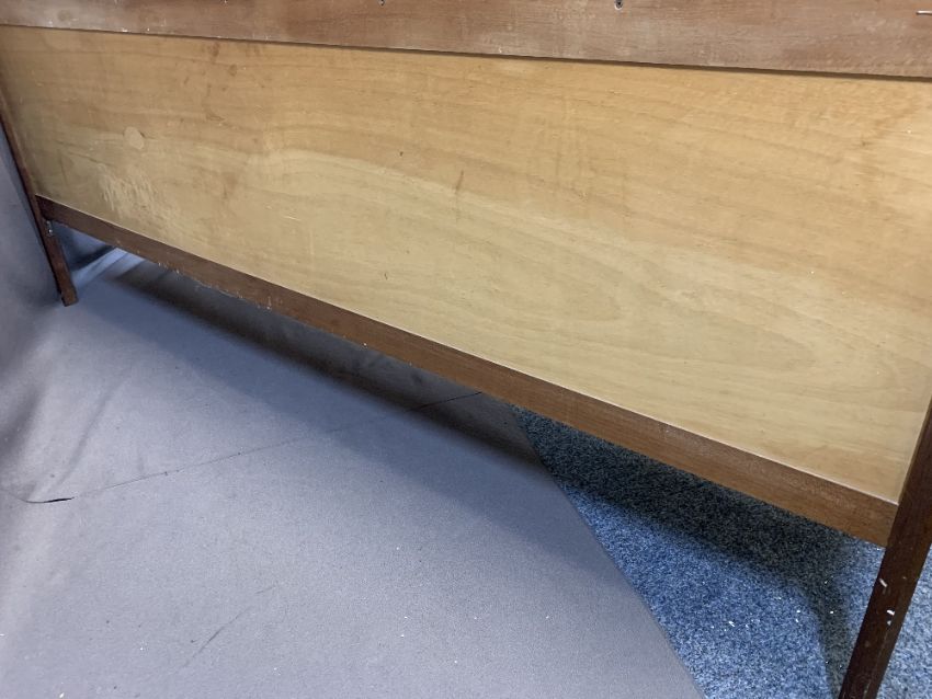 WRIGHTON MID-CENTURY ROSEWOOD LONG SIDEBOARD having a tray type top, octagonal supports and an arrangement of three opening drawers and twin pairs of bi-fold doors, all having inset ring handles, 76.5cms H, 198.5cms overall L, 45.5cms max D