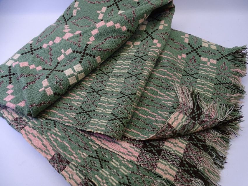 VINTAGE WELSH WOOLLEN BLANKET in green and pink reversible traditional pattern, 232 x 205cms approximately