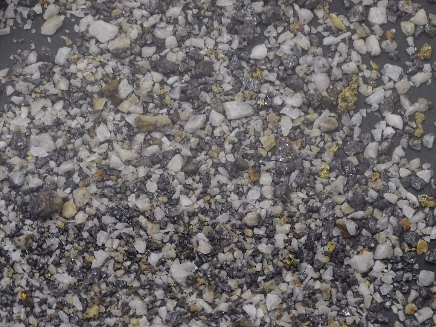 WELSH GOLD contained within a sample of crushed rock, proximity of The Gwynfynydd Mine, Dolgellau circa 1993 and displayed as a loose quantity under perspex in a black frame, 27 x 27cms