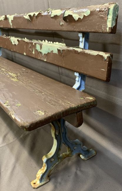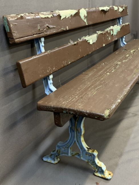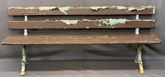 VINTAGE WOODEN GARDEN BENCH on decorative cast iron supports, 73cms H, 183cms L, 42cms overall D
