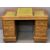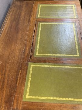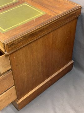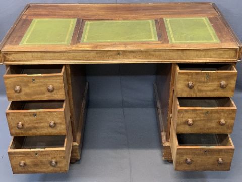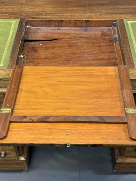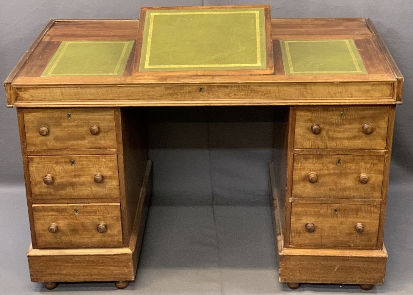 CIRCA 1900 MAHOGANY TWIN PEDESTAL DESK, the top with three section gilt tooled leather inserts, the central section on Ratchet lift to provide slope over twin banks of three drawers with turned wooden knobs on a plinth base with turned wooden feet, 72cms overall H, 113.5cms W, 65.5cms D